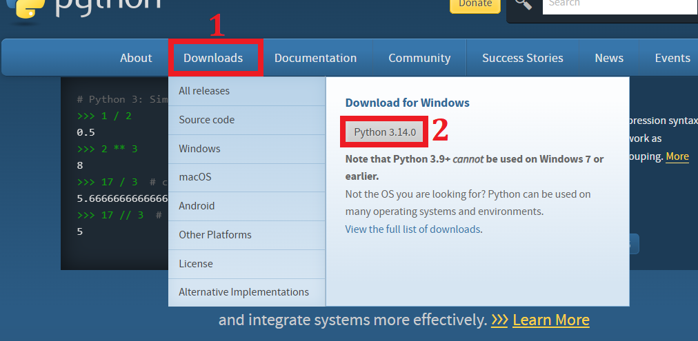 هنگامی اشاره گر موس خود را روی تب Downloads ( مستطیل قرمز رنگ شماره ۱ ) نگه دارید صفحهای مشابه زیر بالا میاد که در سمت راست آخرین نسخه پایتون رو ( در اینجا برای من تا این لحظه، آخرین نسخه پایتون ۳.۱۴ است.) قرار داده است ( مستطیل قرمز رنگ شماره ۲ ) که اگر روش کلیک کنید، به صورت خودکار آخرین نسخه پایتون را دانلود میکند. اندکی صبر کنید تا دانلود پایتون به اتمام برسد.